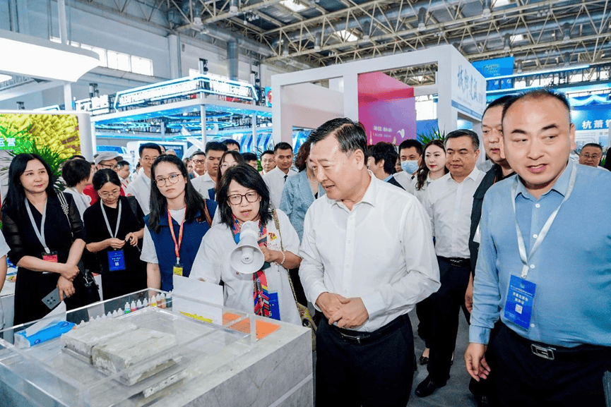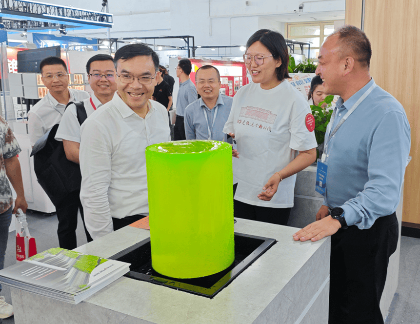 姜萬榮副部長(zhǎng)參觀澎內(nèi)傳展臺(tái),邊聽講解、邊認(rèn)真觀看水池池壁裂縫自愈合實(shí)際應(yīng)用效果。